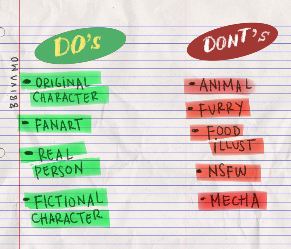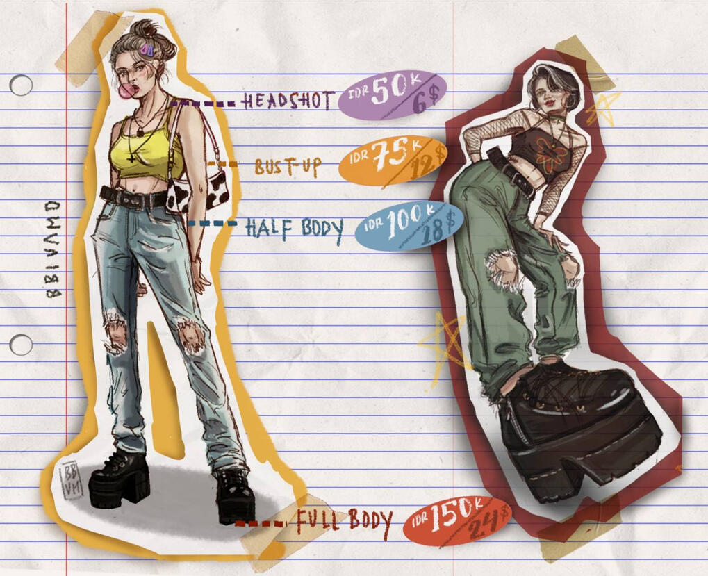 Komisi tersebut tidak memuat hal-hal yang berhubungan dengan furry, gore, NSFW, agama, politik, rasis / diskriminasi. Jika anda memiliki referensi atau instruksi yang jelas, silahkan hubungi kami melalui (email, Dm).PENGGUNAAN.