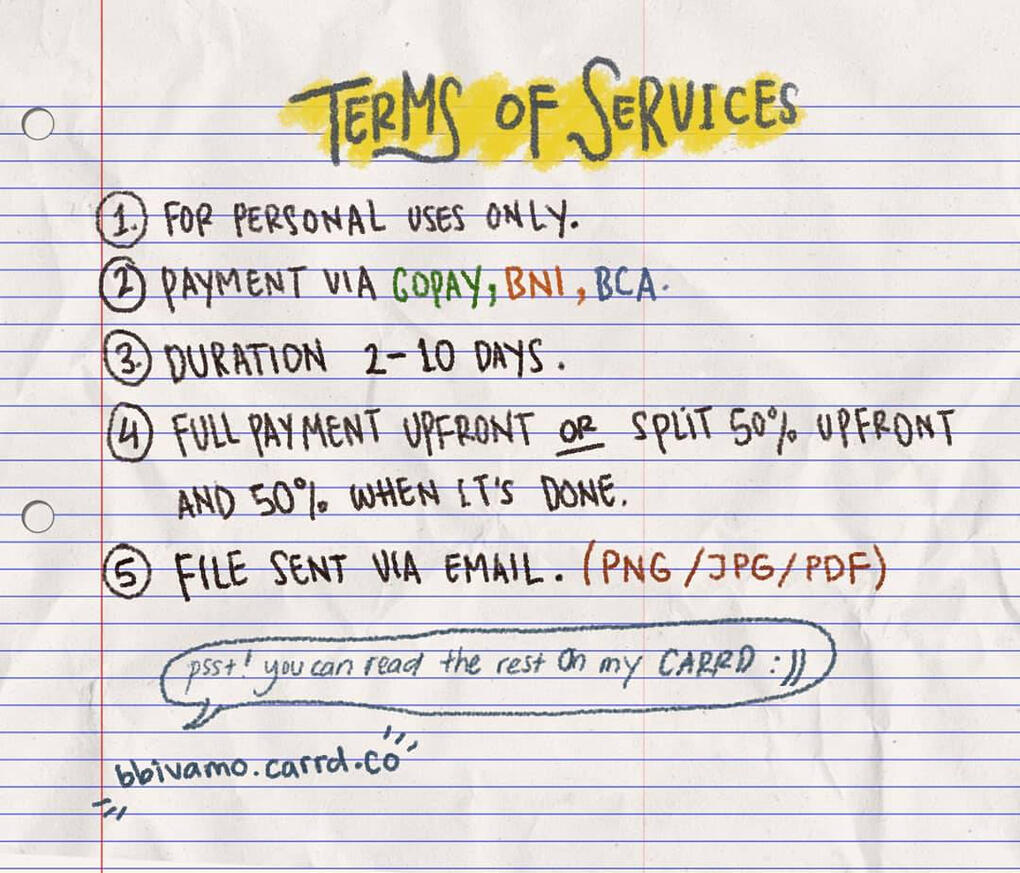 Karya seni yang ditugaskan hanya untuk penggunaan pribadi klien. Memposting ulang di media sosial anda harus diberi kredit dengan benar. Mendistribusikannya kembali untuk mendapatkan keuntungan tidak diperbolehkan dan ilegal. Saya akan meminta izin anda untuk mengunggah di media sosial saya dengan watermark. Saya berhak atas hasil karya seni saya. Artinya saya dapat menggunakannya di mana saja, baik itu portofolio saya atau situs media sosial.PROSES.